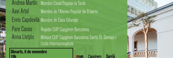 Una de les realitats del districte és la demanda de més espais per a associacions, col·lectius i joves. Això, vinculat a la diferència en la gestió dels espais comunitaris, casals populars, centres cívics, etc. i la participació del veïnat en la mateixa ens ha portat a voler debatre al voltant d’aquests diferents models. Des de l’okupació al model de cessió d’ús, fins a la gestió comunitària amb exemples propers com Casa Orlandai i en un altre sentit Vil·la Urània, entenem que és important valorar i posar damunt la taula conjuntament amb el veïnat com volem que siguin aquests espais. En aquest sentit, apostem per debatre obertament sobre similituds i diferències, el que impliquen i com podem millorar-les. Com gestionem els nostres espais de referència? Com desenvolupem comunitat en espais de trobada? Què es pot fer des de l’Ajuntament i els moviments populars?